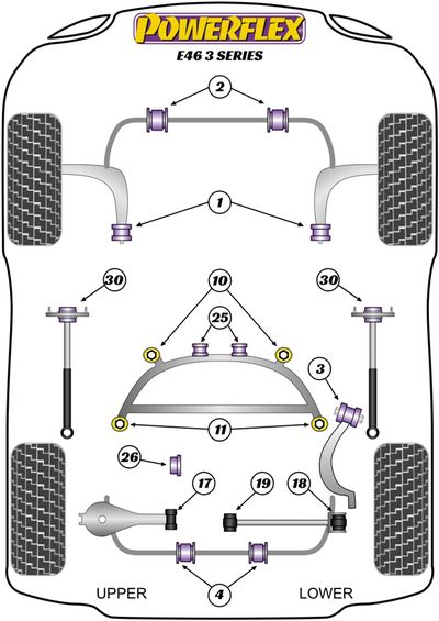 Les silentblocs Powerflex sont fabriqués en polyuréthane de qualité supérieure, apportant une meilleure longévité et une rigidité accrue par rapport aux silentblocs constructeurs (25 à 40% pour la gamme routière). Le polyuréthane est traité pour résister aux différentes souillures qu'il pourrait rencontrer au fil de sa vie (eau, saletés, huiles...) et va contribuer à améliorer la tenue de route de votre véhicule. Les versions Compétition (références se terminant par BLK) ou Black Series sont conseillées pour les véhicules de compétition (sauf Gr N), de circuit, ou préparés, étant mieux adaptés à un usage extrême. N’hésitez pas à nous contacter pour tout conseil sur le choix de la gamme le plus adapté à votre usage.