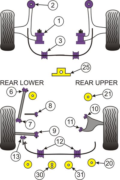 Les silentblocs Powerflex sont fabriqués en polyuréthane de qualité supérieure, apportant une meilleure longévité et une rigidité accrue par rapport aux silentblocs constructeurs (25 à 40% pour la gamme routière). Le polyuréthane est traité pour résister aux différentes souillures qu'il pourrait rencontrer au fil de sa vie (eau, saletés, huiles...) et va contribuer à améliorer la tenue de route de votre véhicule. Les versions Compétition (références se terminant par BLK) ou Black Series sont conseillées pour les véhicules de compétition (sauf Gr N), de circuit, ou préparés, étant mieux adaptés à un usage extrême. N’hésitez pas à nous contacter pour tout conseil sur le choix de la gamme le plus adapté à votre usage.
